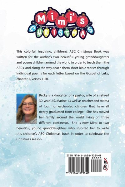 This colorful, inspiring, children's ABC Christmas Book was written for the author's two beautiful young granddaughters and young children around the world in order to teach them the ABCs, and along the way, teach them short Bible stories through individual poems for each letter based on the Gospel of Luke, chapter 2, verses 1-20. Becky is a daughter of a pastor, wife of a retired 30-year U.S. Marine, as well as teacher and mama of four homeschooled children that have all nearly graduated from college. She has moved her family around the world living on three different continents. She is now Mimi to two beautiful, young granddaughters who inspired her to write this children's ABC Christmas book in order to celebrate the Christmas season.