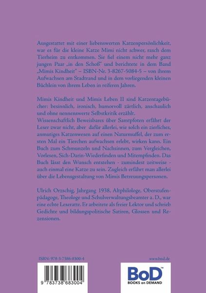 Ausgestattet mit einer liebenswerten Katzenpersönlichkeit, war es für die kleine Katze Mimi nicht schwer, rasch dem Tierheim zu entkommen. Sie fiel einem nicht mehr ganz jungen Paar "in den Schoß" und berichtete in dem Band "Mimis Kindheit" - ISBN-Nr. 3-8267-5084-5 - von ihrem Aufwachsen am Stadtrand und in dem vorliegenden kleinen Büchlein von ihrem Leben in reiferen Jahren. Mimis Kindheit und Mimis Leben II sind Katzentagebücher: besinnlich, ironisch, humorvoll zärtlich, anschaulich und - ohne nennenswerte Selbstkritik erzählt.Wissenschaftlich Beweisbares über Samtpfoten erfährt der Leser zwar nicht, aber dafür allerlei, wie solch ein zierliches, anmutiges Katzenwesen auf einen Naturmuffel, der zum ersten Mal ein Tierchen aufwachsen erlebt, wirken kann. Ein Buch zum Schmunzeln und Nachsinnen, zum Vergleichen, Vorlesen, Sich-Darin-Wiederfinden und Mitempfinden. Das Buch lässt den Wunsch entstehen - zumindest zeitweise - auch einmal eine Katze zu sein. Zugleich erfährt man allerlei über die Lebensgestaltung von Mimis Betreuungspersonen.