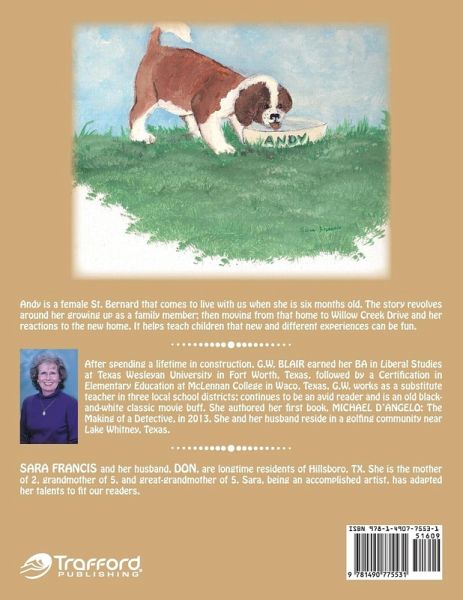 Andy is a female St. Bernard that comes to live with us when she is six months old. The story revolves around her growing up as a family member; then moving from that home to Willow Creek Drive and her reactions to the new home. It helps teach children that new and different experiences can be fun.