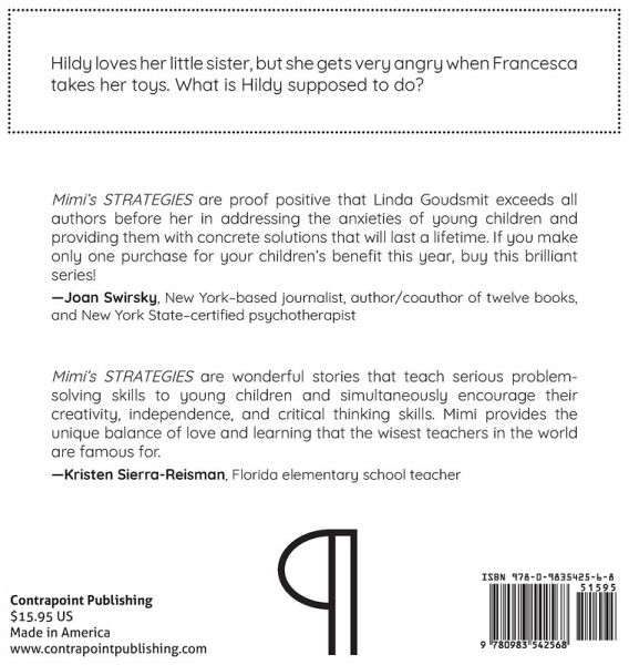 Hildy loves her little sister, but she gets very angry when Francesca takes her toys. What is Hildy supposed to do? MIMI'S STRATEGIES are educational and offer young children a universal new way of solving their problems and having their needs met. The stories are short and simple with the emphasis on the main character's growth outward in concentric circles from her nuclear family setting to her broader school environment. Learning to think strategically, rather than reacting emotionally, is a valuable problem solving skill that will empower any child throughout his/her life. Competence is the mother of self-esteem. Being resourceful, thinking independently, and behaving assertively are behavior traits that motivate children toward individual thinking, achievement, compassion, and fairness on their journey to adulthood.