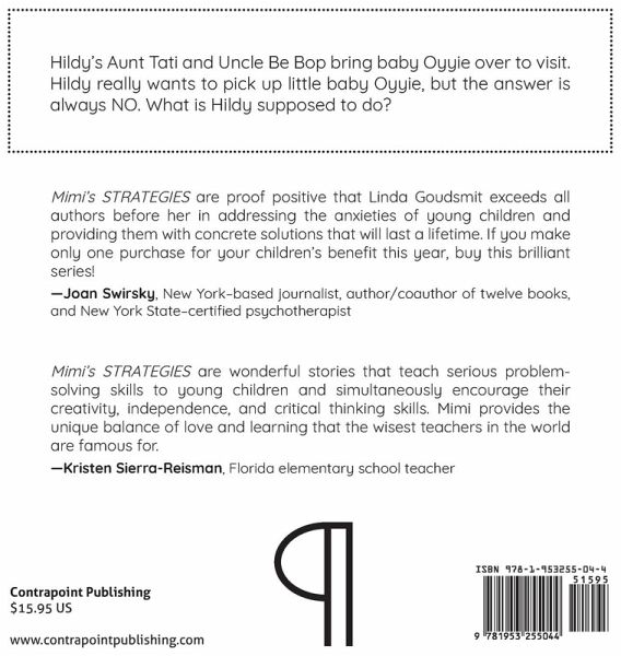 Hildy's Aunt Tati and Uncle BeBop bring little baby Oyyie over to visit. Hildy really, really, really wants to pick up baby Oyyie, but the answer is always NO! What is Hildy supposed to do? MIMI'S STRATEGIES are educational and offer young children a universal new way of solving their problems and having their needs met. The stories are short and simple with the emphasis on the main character's growth outward in concentric circles from her nuclear family setting to her broader school environment. Learning to think strategically rather than reacting emotionally is a valuable problem solving…mehr