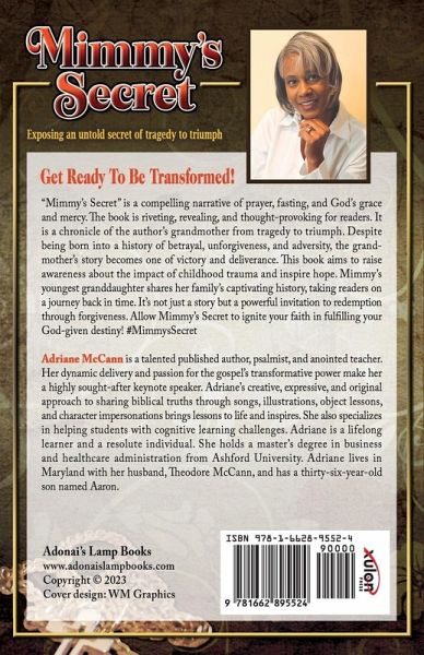 Get Ready To Be Transformed! "Mimmy's Secret" is a compelling narrative of prayer, fasting, and God's grace and mercy. The book is riveting, revealing, and thought-provoking for readers. It is a chronicle of the author's grandmother from tragedy to triumph. Despite being born into a history of betrayal, unforgiveness, and adversity, the grandmother's story becomes one of victory and deliverance. This book aims to raise awareness about the impact of childhood trauma and Inspire hope. Mimmy's youngest granddaughter shares her family's captivating history, taking readers on a journey back in time. It's not just a story but a powerful invitation to redemption through forgiveness. Allow Mimmy's Secret to ignite your faith in fulfilling your God-given destiny! #MimmysSecret Adriane McCann is a talented published author, psalmist, and anointed teacher. Her dynamic delivery and passion for the gospel's transformative power make her a highly sought-after keynote speaker. Adriane's creative, expressive, and original approach to sharing biblical truths through songs, illustrations, object lessons, and character impersonations brings lessons to life and inspires. She also specializes in helping students with cognitive learning challenges. Adriane is a lifelong learner and a resolute individual. She holds a master's degree in business and healthcare administration from Ashford University. Adriane lives in Maryland with her husband, Theodore McCann, and has a thirty-six-year-old son named Aaron.