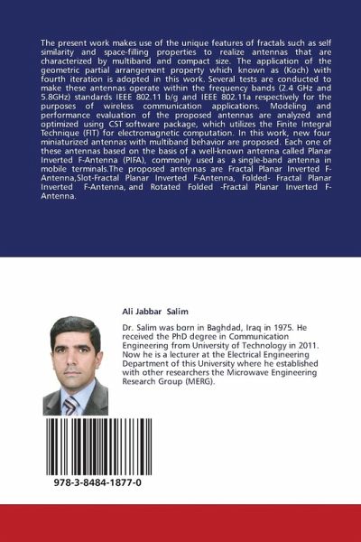 The present work makes use of the unique features of fractals such as self similarity and space-filling properties to realize antennas that are characterized by multiband and compact size. The application of the geometric partial arrangement property which known as (Koch) with fourth iteration is adopted in this work. Several tests are conducted to make these antennas operate within the frequency bands (2.4 GHz and 5.8GHz) standards IEEE 802.11 b/g and IEEE 802.11a respectively for the purposes of wireless communication applications. Modeling and performance evaluation of the proposed antennas are analyzed and optimized using CST software package, which utilizes the Finite Integral Technique (FIT) for electromagnetic computation. In this work, new four miniaturized antennas with multiband behavior are proposed. Each one of these antennas based on the basis of a well-known antenna called Planar Inverted F-Antenna (PIFA), commonly used as a single-band antenna in mobile terminals.The proposed antennas are Fractal Planar Inverted F-Antenna,Slot-Fractal Planar Inverted F-Antenna, Folded- Fractal Planar Inverted F-Antenna, and Rotated Folded -Fractal Planar Inverted F-Antenna.
