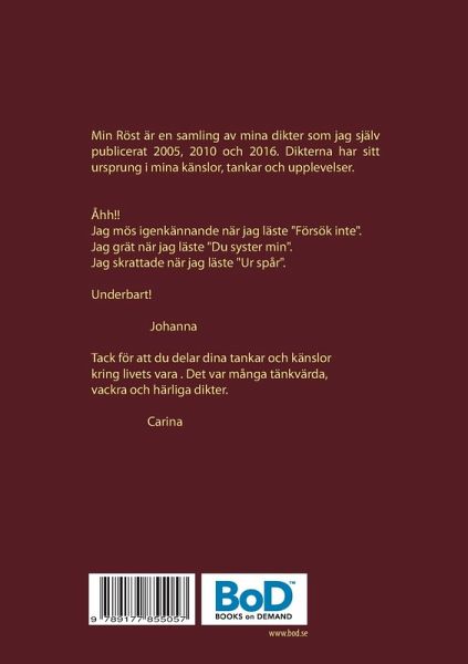 Min Röst är en samling av mina dikter som jag själv publicerat 2005, 2010 och 2016. Dikterna har sitt ursprung i mina känslor, tankar och upplevelser.