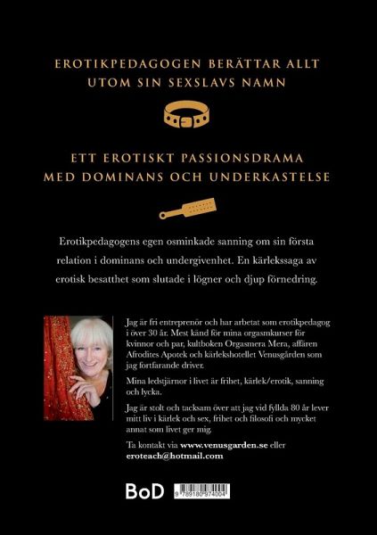 EROTIKPEDAGOGEN BERÄTTAR ALLT UTOM SIN SEXSLAVS NAMN ETT EROTISKT PASSIONSDRAMA MED DOMINANS OCH UNDERKASTELSE Erotikpedagogens egen osminkade sanning om sin första relation i dominans och undergivenhet. En kärlekssaga av erotisk besatthet som slutade i lögner och djup förnedring.