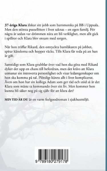 37-åriga Klara älskar sitt jobb som barnmorska på BB i Uppsala. Men den största pusselbiten i livet saknas - en familj. För några år sedan var drömmen nära att bli verklighet, men allt gick i spillror och lämnade Klara ensam med sorgen. När hon träffar Rikard, den omtyckta barnläkaren, verkar drömmen ännu en gång vara inom räckhåll. Tills Klara får reda på att han är gift. Samtidigt tvingar en chans att bli befordrad Klara att utmana sin introverta personlighet och visa ledaregenskaper på BB. Min tid är du är en varm feelgoodroman i sjukhusmiljö.