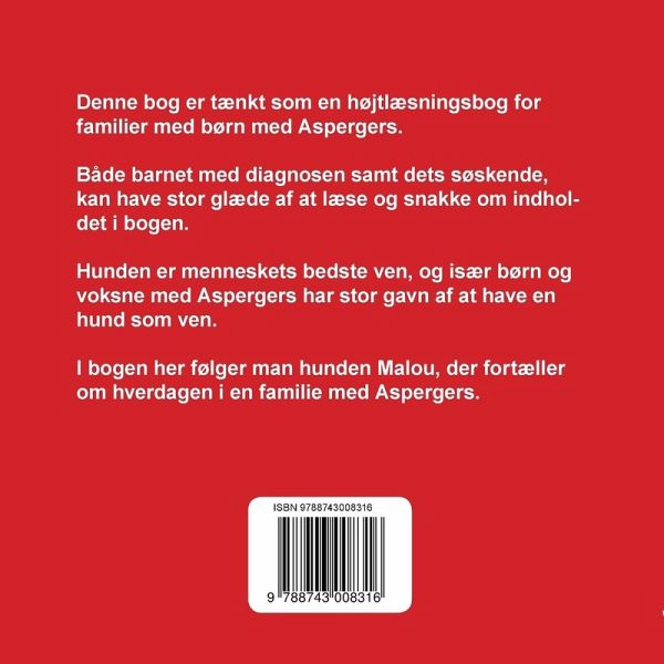 Denne bog er tænkt som en højtlæsningsbog for familier med børn med Aspergers. Både barnet med diagnosen samt dets søskende, kan have stor glæde af at læse og snakke om indholdet i bogen. Gennem bogen følger man en lille sort familiehund, der hedder Malou, der bor i en familie med en mor, en far, en lillesøster og en storebror. I bogen fortæller den om sin ven. Han er 11 år gammel og har for nylig fået diagnosen, Aspergers. Den fortæller om helt almindelige hverdagssituationer i familien og om sin ven med Aspergers.