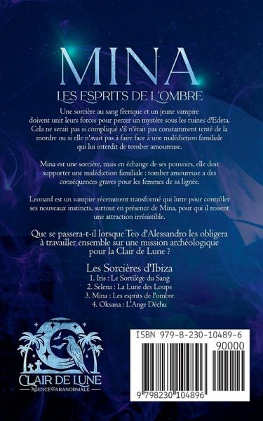 Une sorcière au sang féerique et un jeune vampire doivent unir leurs forces pour percer un mystère sous les ruines d'Edeta. Cela ne serait pas si compliqué s'il n'était pas constamment tenté de la mordre ou si elle n'avait pas à faire face à une malédiction familiale qui lui interdit de tomber amoureuse. Mina est une sorcière, mais en échange de ses pouvoirs, elle doit supporter une malédiction familiale : tomber amoureuse a des conséquences graves pour les femmes de sa lignée. Leonard est un vampire récemment transformé qui lutte pour contrôler ses nouveaux instincts, surtout en présence de Mina, pour qui il ressent une attraction irrésistible. Que se passera-t-il lorsque Teo d'Alessandro les obligera à travailler ensemble sur une mission archéologique pour la Clair de Lune ? Bienvenue à l'Agence Paranormale Clair de Lune, Ibiza. Accompagnez Mina et Leonard dans leur mission alors qu'ils résolvent l'énigme des ruines et cherchent un portail secret, qui pourrait libérer l'Obscurité Primordiale sur le monde des surnaturels. Cette romance paranormale est le troisième livre de Sorcières d'Ibiza, mais vous pouvez le lire comme une histoire indépendante d'aventures et de fantasy urbaine.