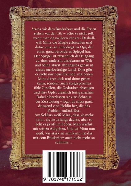 Stress mit dem Bruderherz und die Ferien stehen vor der Tür - wäre es nicht toll, wenn man da zaubern könnte? Deshalb will Mina die Magie erforschen und dafür muss sie unbedingt zu Opi, der einen ganz besonderen Spiegel hat.Der Spiegel ist tatsächlich der Eingang zu einer anderen, unbekannten Welt und Mina stürzt ahnungslos genau in dieses merkwürdige Land. Dort gibt es nicht nur neue Freunde, mit denen Mina durch dick und dünn gehen kann, sondern auch ausgesprochen üble Gesellen, die Gedanken absaugen und ihre Opfer ziemlich fertig machen.Dabei hinterlassen sie eine Schneise der Zerstörung - logo, da muss ganz dringend eine Heldin her, die das Problem endlich löst.Am Schluss weiß Mina, dass sie mehr kann, als sie anfangs dachte, aber so geht es ja oft im Leben: Man wächst mit seinen Aufgaben. Und da Mina nun weiß, wie stark sie sein kann, ist das mit dem Bruderherz auch nicht mehr so schlimm ...