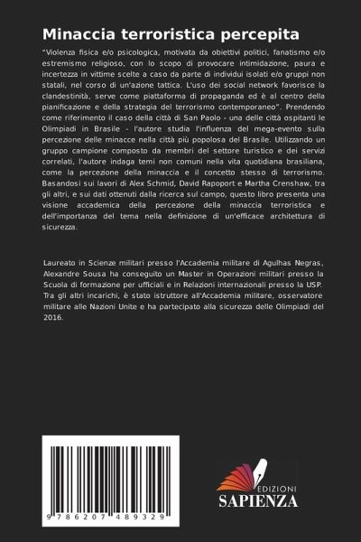 ¿Violenza fisica e/o psicologica, motivata da obiettivi politici, fanatismo e/o estremismo religioso, con lo scopo di provocare intimidazione, paura e incertezza in vittime scelte a caso da parte di individui isolati e/o gruppi non statali, nel corso di un'azione tattica. L'uso dei social network favorisce la clandestinità, serve come piattaforma di propaganda ed è al centro della pianificazione e della strategia del terrorismo contemporaneö. Prendendo come riferimento il caso della città di San Paolo - una delle città ospitanti le Olimpiadi in Brasile - l'autore studia l'influenza del mega-evento sulla percezione delle minacce nella città più popolosa del Brasile. Utilizzando un gruppo campione composto da membri del settore turistico e dei servizi correlati, l'autore indaga temi non comuni nella vita quotidiana brasiliana, come la percezione della minaccia e il concetto stesso di terrorismo. Basandosi sui lavori di Alex Schmid, David Rapoport e Martha Crenshaw, tra gli altri, e sui dati ottenuti dalla ricerca sul campo, questo libro presenta una visione accademica della percezione della minaccia terroristica e dell'importanza del tema nella definizione di un'efficace architettura di sicurezza.