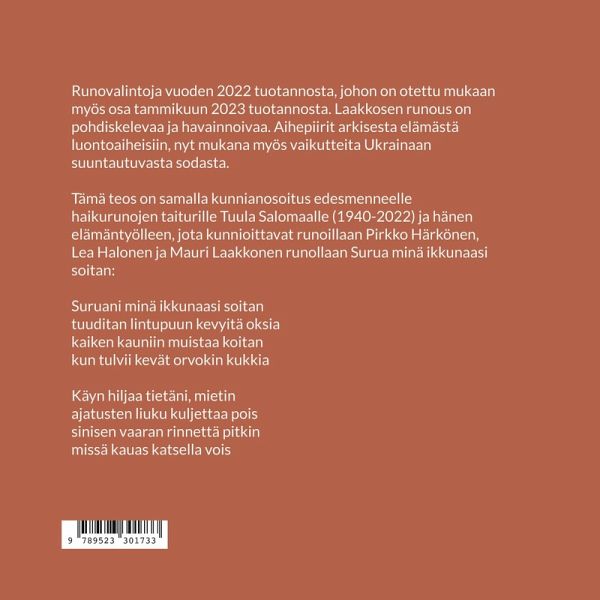 Runovalintoja vuoden 2022 tuotannosta, johon on otettu mukaan myös osa tammikuun 2023 tuotannosta. Laakkosen runous on pohdiskelevaa ja havainnoivaa. Aihepiirit arkisesta elämästä luontoaiheisiin, nyt mukana myös vaikutteita Ukrainan suuntautuvasta sodasta. Tämä teos on samalla kunnianosoitus edesmenneelle haikurunojen taiturille Tuula Salomaalle (1940-2022) ja hänen elämäntyölleen, jota kunnioittavat runoillaan Pirkko Härkönen, Lea Halonen ja Mauri Laakkonen runollaan Surua minä ikkunaasi soitan: Suruani minä ikkunaasi soitan tuuditan lintupuun kevyitä oksia kaiken kauniin muistaa koitan kun tulvii kevät orvokin kukkia Käyn hiljaa tietäni, mietin ajatusten liuku kuljettaa pois sinisen vaaran rinnettä pitkin missä kauas katsella vois