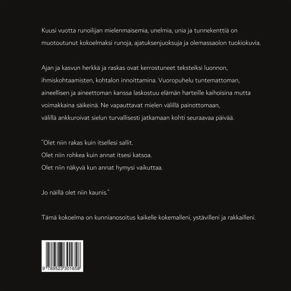Runoja ja tekstejä miehen mielenmaisemasta. Sanoja ja lauseita olemassaolon pohjattomasta syvyydestä ja äärettömästä korkeudesta.