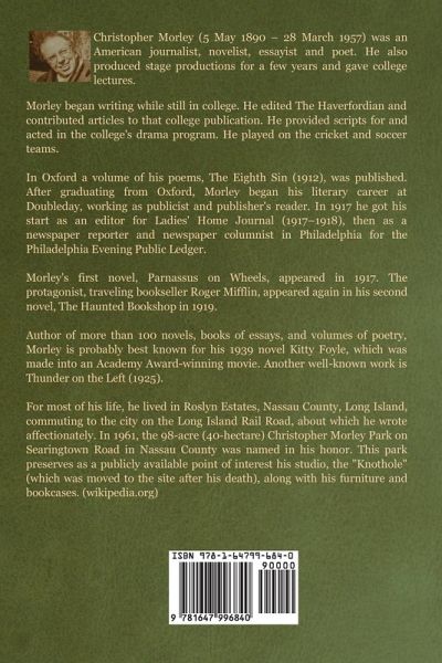 Christopher Morley (5 May 1890 - 28 March 1957) was an American journalist, novelist, essayist and poet. He also produced stage productions for a few years and gave college lectures. Morley began writing while still in college. He edited The Haverfordian and contributed articles to that college publication. He provided scripts for and acted in the college's drama program. He played on the cricket and soccer teams. In Oxford a volume of his poems, The Eighth Sin (1912), was published. After graduating from Oxford, Morley began his literary career at Doubleday, working as publicist and publisher's reader. In 1917 he got his start as an editor for Ladies' Home Journal (1917-1918), then as a newspaper reporter and newspaper columnist in Philadelphia for the Philadelphia Evening Public Ledger. Morley's first novel, Parnassus on Wheels, appeared in 1917. The protagonist, traveling bookseller Roger Mifflin, appeared again in his second novel, The Haunted Bookshop in 1919. He was one of the founders and a longtime contributing editor of the Saturday Review of Literature. A highly gregarious man, he was the mainstay of what he dubbed the "Three Hours for Lunch Club". Out of enthusiasm for the Sherlock Holmes stories, he helped found The Baker Street Irregulars and wrote the introduction to the standard omnibus edition of The Complete Sherlock Holmes. He also wrote an introduction to the standard omnibus edition of The Complete Works of Shakespeare in 1936, although Morley called it an "Introduction to Yourself as a Reader of Shakespeare". That year, he was appointed to revise and enlarge Bartlett's Familiar Quotations (11th edition in 1937 and 12th edition in 1948). He was one of the first judges for the Book of the Month Club, serving in that position until the early 1950s. Author of more than 100 novels, books of essays, and volumes of poetry, Morley is probably best known for his 1939 novel Kitty Foyle, which was made into an Academy Award-winning movie. Another well-known work is Thunder on the Left (1925). For most of his life, he lived in Roslyn Estates, Nassau County, Long Island, commuting to the city on the Long Island Rail Road, about which he wrote affectionately. In 1961, the 98-acre (40-hectare) Christopher Morley Park on Searingtown Road in Nassau County was named in his honor. This park preserves as a publicly available point of interest his studio, the "Knothole" (which was moved to the site after his death), along with his furniture and bookcases. (wikipedia.org)