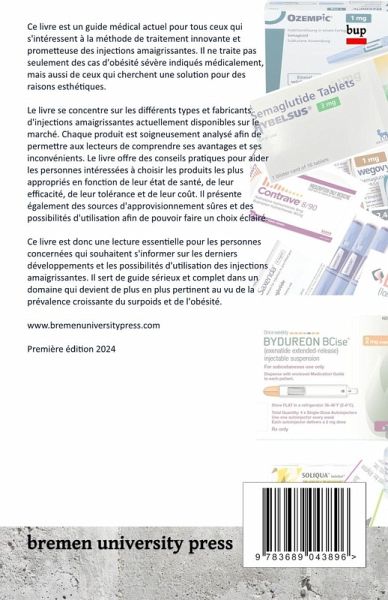 Ce livre est un guide médical actuel destiné à tous ceux qui s'intéressent à la méthode de traitement innovante et prometteuse des injections amaigrissantes. Il ne traite pas seulement des cas d'obésité sévère indiqués médicalement, mais aussi de ceux qui recherchent une solution pour des raisons esthétiques. Le livre se concentre sur les différents types et fabricants d'injections amaigrissantes actuellement disponibles sur le marché. Chaque produit est soigneusement analysé afin de permettre aux lecteurs de comprendre ses avantages et ses inconvénients. Le livre offre des conseils pratiques pour aider les personnes intéressées à choisir les produits les plus appropriés en fonction de leur état de santé, de leur efficacité, de leur tolérance et de leur coût. Il présente également des sources d'approvisionnement sûres et des possibilités d'utilisation afin de pouvoir faire un choix éclairé. Un autre chapitre est consacré aux études cliniques et aux effets à long terme ainsi qu'aux risques et aux effets secondaires des injections amaigrissantes. Cette présentation transparente aide les lecteurs à comprendre et à peser les conséquences possibles du traitement. Pour finir, le livre donne un aperçu des futurs médicaments prometteurs actuellement en cours de recherche. Ce chapitre met en lumière la manière dont le développement de ces médicaments va révolutionner les méthodes de traitement de l'obésité et la médecine esthétique. Ce livre est donc une lecture essentielle pour les personnes concernées qui souhaitent s'informer sur les derniers développements et possibilités dans l'utilisation des injections amaigrissantes. Il sert de guide sérieux et complet dans un domaine qui devient de plus en plus pertinent au vu de la prévalence croissante du surpoids et de l'obésité.