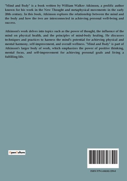 "Mind and Body" is a book written by William Walker Atkinson, a prolific author known for his work in the New Thought and metaphysical movements in the early 20th century. In this book, Atkinson explores the relationship between the mind and the body and how the two are interconnected in achieving personal well-being and success. Atkinson's work delves into topics such as the power of thought, the influence of the mind on physical health, and the principles of mind-body healing. He discusses techniques and practices to harness the mind's potential for achieving physical and mental harmony, self-improvement, and overall wellness. "Mind and Body" is part of Atkinson's larger body of work, which emphasizes the power of positive thinking, mental focus, and self-improvement for achieving personal goals and living a fulfilling life.