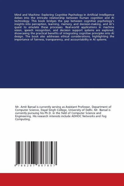 Mind and Machine: Exploring Cognitive Psychology in Artificial Intelligence delves into the intricate relationship between human cognition and AI technology. This book bridges the gap between cognitive psychology's insights into perception, learning, memory, and decision-making, and AI's quest to emulate these processes. Real-world applications in machine vision, speech recognition, and decision support systems are explored, showcasing the practical benefits of integrating cognitive principles into AI design. The book also addresses ethical considerations, highlighting the importance of fairness, transparency, and accountability in AI systems.