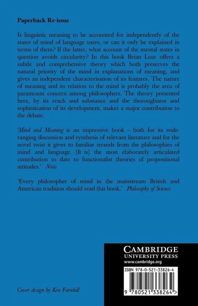 Is linguistic meaning to be accounted for independently of the states of mind of language users, or can it only be explained in terms of them? If the latter, what account of the mental states in question avoids circularity? In this book Brian Loar offers a subtle and comprehensive theory that both preserves the natural priority of the mind in explanations of meaning, and gives an independent characterisation of its features. the nature of meaning and its relation to the mind is probably the area of paramount concern among philosophers. The theory presented here, by its reach and substance and the thoroughness and sophistication of its development, makes a major contribution to the debate.