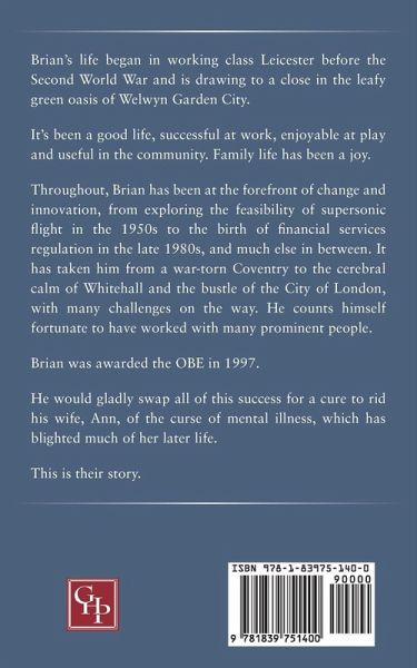 Brian's life began in working class Leicester before the 2nd World War. It has been a good life, successful at work, enjoyable at play and useful in the community. Family life has been a joy. Throughout, he has been at the forefront of change and innovation, from the exploration of supersonic flight in war-torn Coventry in the 1950s to the birth of financial services regulation in the City of London in the 1980s, and much else in between. Brian was awarded the OBE in 1997. He would gladly swap all of this success to rid his wife of the curse of mental illness, which has blighted much of her later life.