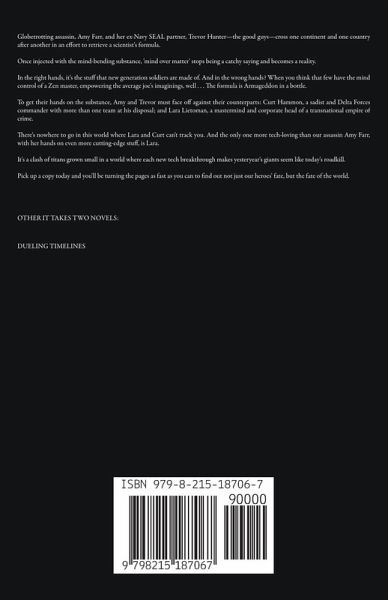 Globetrotting assassin, Amy Farr, and her ex-Navy SEAL partner, Trevor Hunter—the good guys—cross one continent and one country after another in an effort to retrieve a scientist's formula. Once injected with the mind-bending substance, 'mind over matter' stops being a catchy saying and becomes a reality. In the right hands, it's the stuff that new generation soldiers are made of. And in the wrong hands? When you think that few have the mind control of a Zen master, empowering the average joe's imaginings, well . . . The formula is Armageddon in a bottle. To get their hands on the substance, Amy and Trevor must face off against their counterparts: Curt Hammon, a sadist and Delta Forces commander with more than one team at his disposal; and Lara Lietoman, a mastermind and corporate head of a transnational empire of crime. There's nowhere to go in this world where Lara and Curt can't track you. And the only one more tech-loving than our assassin Amy Farr, with her hands on even more cutting-edge stuff, is Lara. It's a clash of titans grown small in a world where each new tech breakthrough makes yesteryear's giants seem like today's roadkill. Pick up a copy today and you'll be turning the pages as fast as you can to find out not just our heroes' fate, but the fate of the world. OTHER IT TAKES TWO NOVELS: DUELING TIMELINES