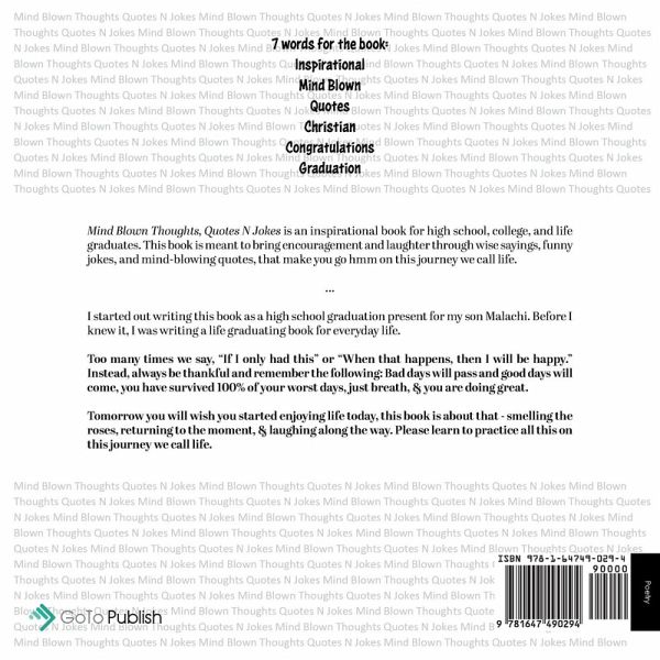 Mind Blown Thoughts, Quotes N Jokes is an inspirational book for high school graduates, college graduates, and life graduates. This book is meant to bring encouragement, and laughter through sayings of the wise, jokes and quotes that make you go hmm in this journey we call life.