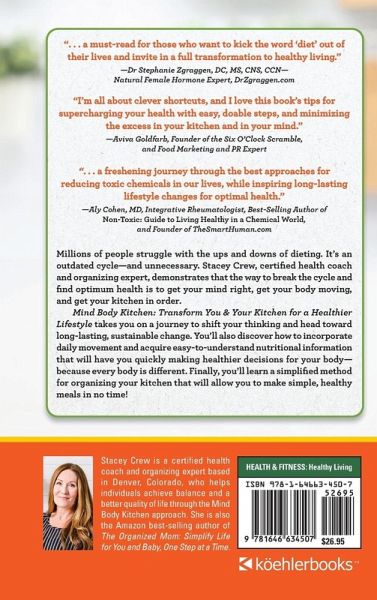 Millions of people struggle with the ups and downs of dieting. It's an outdated cycle-and unnecessary. Stacey Crew, certified health coach and organizing expert, demonstrates that the way to break the cycle and find optimum health is to get your mind right, get your body moving, and get your kitchen in order. ¿Mind Body Kitchen: Transform You & Your Kitchen for a Healthier Lifestyle takes you on a journey to shift your thinking and head toward long-lasting, sustainable change. You'll also discover how to incorporate daily movement and acquire easy-to-understand nutritional information that will have you quickly making healthier decisions for your body-because every body is different. Finally, you'll learn a simplified method for organizing your kitchen that will allow you to make simple, healthy meals in no time!