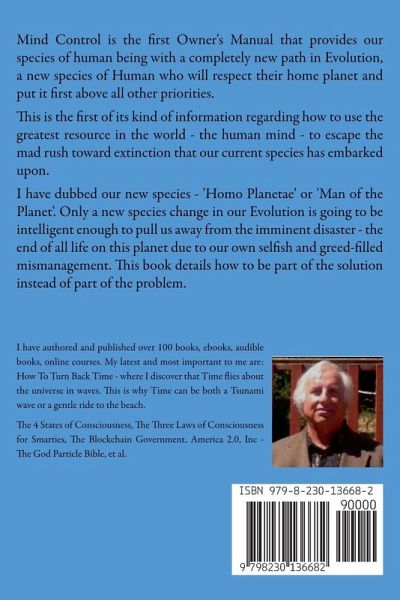 A.I. or - Thinking outside the box! Mind Control is the first Owner's Manual that will help usher in a new species of human being, a species who will respect their home planet and put it first above all other priorities. I call him 'Homo Planetae' or Man of the Planet. Homo Sapiens or the Wise Man is no longer viable since it is this species that has brought us to the edge of extinction and the total destruction of this planet's habitat - something no other creature in history has been so careless and greedy to do. We did that. An evolutionary branching off of an obsolete species and onto a new more advanced creature is now taking place right before our eyes, but 'None are so blind as those who will not see.' Through your increased abilities of using your mind or 'Mind Control' as this author defines it - we still have a chance to redeem ourselves and save this planet. But time is of the essence and is rapidly running fading. The ways in which we are mind controlled by our government and our corporations, our religions are profound yet so subtle we don't even think about it until it's too late. In this book you will find the new rules of our future evolution, some mind control exercises that will make you more in charge of your life and ways to turn us away from our current path towards the precipice, oblivion, the cliff. It's not out of the question, but every day we put off joining the growing list of people who know about Mind Control and the Owner's Manual, the greater are the chances that we may be able to save ourselves. All future generations will thank us - but only if YOU show you are part of us. All throughout history there has never been an event where an individual as part of their species has been able to directly alter the next species in their own Evolution. This year, but only armed with the information in this book, you can experience a first of its kind on this Earth. From our technology, we are on the verge of creating an intelligence and later even a consciousness that is kept outside of our skulls and in a box that we humans can control. The creators of this new technology - A.I. - are warning us that these next few years could witness our mass extinction due to the improved level of ability of the robots that Artificial Intelligence will power and manage. This is literally thinking outside the box. This Owner's Manual provides protection from the Triple Tipping Point of the growing Climate Crisis, The takeover by A.I. and global thermo-nuclear war.