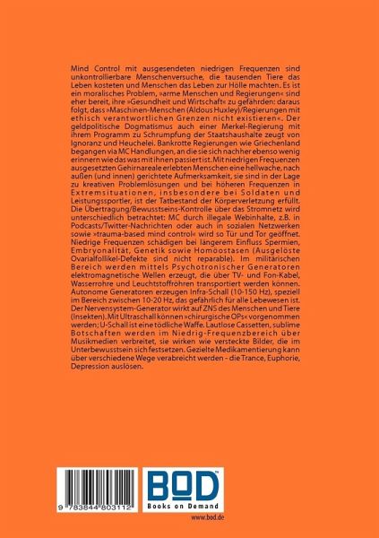 Mind Control mit ausgesendeten niedrigen Frequenzen sind unkontrollierbare Menschenversuche, die tausenden Tiere das Leben kosteten und Menschen das Leben zur Hölle machten. Es ist ein moralisches Problem, »arme Menschen und Regierungen« sind eher bereit, ihre »Gesundheit und Wirtschaft« zu gefährden: daraus folgt, dass »Maschinen-Menschen (Aldous Huxley)/Regierungen mit ethisch verantwortlichen Grenzen nicht existieren«. Der geldpolitische Dogmatismus auch einer Merkel-Regierung mit ihrem Programm zu Schrumpfung der Staatshaushalte zeugt von Ignoranz und Heuchelei. Bankrotte Regierungen wie Griechenland begangen via MC Handlungen, an die sie sich nachher ebenso wenig erinnern wie das was mit ihnen passiert ist. Mit niedrigen Frequenzen ausgesetzten Gehirnareale erlebten Menschen eine hellwache, nach außen (und innen) gerichtete Aufmerksamkeit, sie sind in der Lage zu kreativen Problemlösungen und bei höheren Frequenzen in Extremsituationen, insbesondere bei Soldaten und Leistungssportler, ist der Tatbestand der Körperverletzung erfüllt. Die Übertragung/Bewusstseins-Kontrolle über das Stromnetz wird unterschiedlich betrachtet: MC durch illegale Webinhalte, z.B. in Podcasts/Twitter-Nachrichten oder auch in sozialen Netzwerken sowie »trauma-based mind control« wird so Tür und Tor geöffnet. Niedrige Frequenzen schädigen bei längerem Einfluss Spermien, Embryonalität, Genetik sowie Homöostasen (Ausgelöste Ovarialfollikel-Defekte sind nicht reparable). Im militärischen Bereich werden mittels Psychotronischer Generatoren elektromagnetische Wellen erzeugt, die über TV- und Fon-Kabel, Wasserrohre und Leuchtstoffröhren transportiert werden können. Autonome Generatoren erzeugen Infra-Schall (10-150 Hz), speziell im Bereich zwischen 10-20 Hz, das gefährlich für alle Lebewesen ist. Der Nervensystem-Generator wirkt auf ZNS des Menschen und Tiere (Insekten). Mit Ultraschall können »chirurgische OPs« vorgenommen werden; U-Schall ist eine tödliche Waffe. Lautlose Cassetten, sublime Botschaften werden im Niedrig-Frequenzbereich über Musikmedien verbreitet, sie wirken wie versteckte Bilder, die im Unterbewusstsein sich festsetzen. Gezielte Medikamentierung kann über verschiedene Wege verabreicht werden - die Trance, Euphorie, Depression auslösen.
