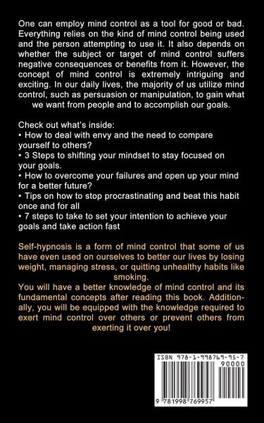 One can employ mind control as a tool for good or bad. Everything relies on the kind of mind control being used and the person attempting to use it. It also depends on whether the subject or target of mind control suffers negative consequences or benefits from it. However, the concept of mind control is extremely intriguing and exciting. In our daily lives, the majority of us utilize mind control, such as persuasion or manipulation, to gain what we want from people and to accomplish our goals. Check out what's inside:How to deal with envy and the need to compare yourself to others? 3 Steps to shifting your mindset to stay focused on your goals. How to overcome your failures and open up your mind for a better future? Tips on how to stop procrastinating and beat this habit once and for all 7 steps to take to set your intention to achieve your goals and take action fast Self-hypnosis is a form of mind control that some of us have even used on ourselves to better our lives by losing weight, managing stress, or quitting unhealthy habits like smoking. You will have a better knowledge of mind control and its fundamental concepts after reading this book. Additionally, you will be equipped with the knowledge required to exert mind control over others or prevent others from exerting it over you!