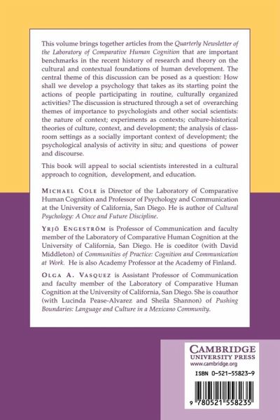 This volume brings together articles from the Quarterly Newsletter of the Laboratory of Comparative Human Cognition that are important benchmarks in the recent history of research and theory on the cultural and contextual foundations of human development. The central theme of this discussion can be posed as a question: how shall we develop a psychology that takes as its starting point the actions of people participating in routine, culturally organized activities? The discussion is organized in terms of a set of overarching themes of importance to psychologists and other social scientists: The nature of context; experiments as contexts; cultural historical theories of culture, context, and development; the analysis of classroom settings as a social important context of development, the psychological analysis of activity in situ, and questions of power and discourse.