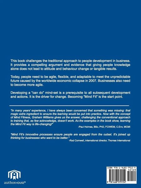 This book challenges the traditional approach to people development in business. It provides a compelling argument and evidence that giving people knowledge alone does not lead to attitude and behaviour change or tangible results. Today, people need to be agile, flexible, and adaptable to meet the unpredictable future caused by the worldwide economic collapse in 2007. Businesses also need to become more agile. Developing a "can do" mind-set is a prerequisite to all subsequent development and actions. It is the driver for change. Becoming "mind fit" is the start point. In many years' experience, I have always been concerned that something was missing: that magic extra ingredient to ensure the learning would be put into practice. Now with the concept of mind fitness, Graham Williams gives us the answer, challenging the conventional approach to training that, as few acknowledge, doesn't work. As the examples in the book show, learning the Mind Fit way is life-changing!" Paul Holmes, BSc, PhD, FCIWEM, C.Env, MCMI Mind Fit's innovative processes ensure people are engaged from the outset. It's joined up thinking for businesses who want to be better. Rod Cornwell, international director, Thomas International