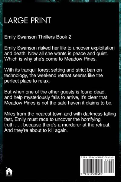 LARGE PRINT EDITION You can't escape your darkest thoughts... Emily Swanson almost died at the hands of a psychopath. Understandably, the ordeal has left its scars. Determined to move on with her life, Emily visits a weekend retreat called Meadow Pines. With its secluded setting and strict ban on technology, it seems like the perfect escape. But is Meadow Pines the safe haven it claims to be? A man is found hanging from a tree. The evidence points to suicide. But when help fails to arrive and the guests start turning on each other, Emily knows she's in terrible trouble. Cut off from the outside world with darkness falling fast, Emily must overcome her trauma to uncover the horrifying truth about Meadow Pines. Because there's a murderer at the retreat - and they're about to kill again. Mind for Murder is the second twist-filled book in the gripping Emily Swanson series from Malcolm Richards.