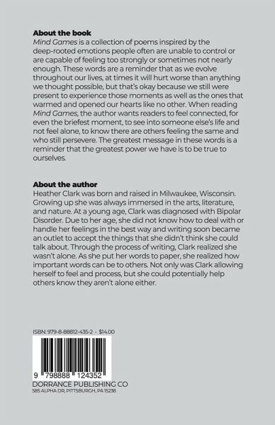 About the Book Mind Games is a collection of poems inspired by the deep-rooted emotions people often are unable to control or are capable of feeling too strongly or sometimes not nearly enough. These words are a reminder that as we evolve throughout our lives, at times it will hurt worse than anything we thought possible, but that's okay because we still were present to experience those moments as well as the ones that warmed and opened our hearts like no other. When reading Mind Games, the author wants readers to feel connected, for even the briefest moment, to see into someone else's life and not feel alone, to know there are others feeling the same and who still persevere. The greatest message in these words is a reminder that the greatest power we have is to be true to ourselves. About the Author Heather Clark was born and raised in Milwaukee, Wisconsin. Growing up she was always immersed in the arts, literature, and nature. At a young age, Clark was diagnosed with Bipolar Disorder. Due to her age, she did not know how to deal with or handle her feelings in the best way and writing soon became an outlet to accept the things that she didn't think she could talk about. Through the process of writing, Clark realized she wasn't alone. As she put her words to paper, she realized how important words can be to others. Not only was Clark allowing herself to feel and process, but she could potentially help others know they aren't alone either.