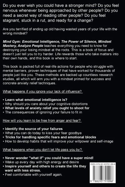 Do you ever wish you could have a stronger mind? Do you feel nervous whenever being approached by other people? Do you need a secret way of reading other people? Do you feel stagnant, stuck in a rut, and ready for a change? Are you terrified of ending up old having wasted years of your life with the wrong mindset?If you keep doing what you've always done, you'll never break free of your lack of mental power. Is this positive for you? Mind Gym: Emotional Intelligence, The Power of Silence, Mindset Mastery, Analyze People teaches everything you need to know for destroying your losing mindset at the roots. This is a book of focus and doesn't just tell you to try harder. Life rewards those who take matters into their own hands, and this book is where to start. This book is packed full of real-life actions for people who struggle with mental barriers, proven techniques that have worked for thousands of people just like you. These methods are backed up countless research studies, all of which will arm you with a mindset primed for success and concrete anxiety relief techniques. Easy-to-implement small changes and practical takeaways for immediate action.What happens if you ignore your lack of influence? ¿ Learn what emotional intelligence is? ¿ Why should you care about your cognitive distortions ¿ What levels of anxiety relief you ought to shoot for ¿ The consequences of ignoring your failure to fit inHow will you learn to be free from anger and fear? ¿ Identify the source of your failures ¿ What you can do today to kiss your fear goodbye ¿ Tricks for handling specific fears and emotional blocks ¿ How to develop habits that will improve your willpower and self-imageWhat happens when you don't let life pass you by? ¿ Never wonder "what if" you could have a super mind! ¿ Wake up every day with high energy and desire ¿ Inspire yourself and others to create the life they want with less stress. ¿ Feel comfortable with yourself again. Find out how to let go of your awkwardness and take flight towards a world of influence, period.Create the life and influence you want.Try Mind Gym: Emotional Intelligence, The Power of Silence, Mindset Mastery, Analyze People today by clicking the BUY NOW button at the top right of this page! P.S. You'll be able to notice a difference in your mental energy within 24 hours.