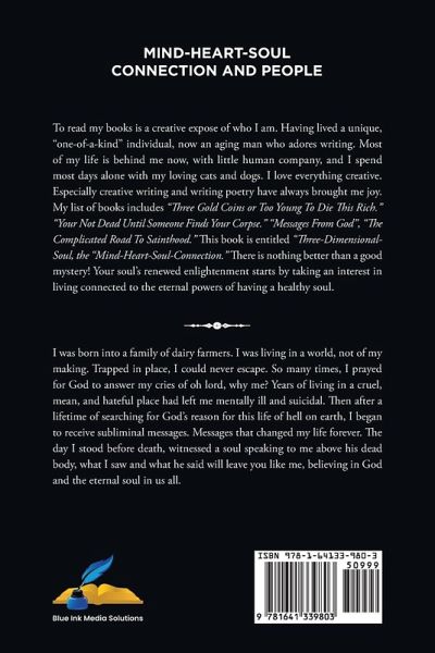 To read my books is a creative expose of who I am. Having lived a unique, "one-of-a-kind" individual, now an aging man who adores writing. Most of my life is behind me now, with little human company, and I spend most days alone with my loving cats and dogs. I love everything creative. Especially creative writing and writing poetry have always brought me joy. My list of books includes "Three Gold Coins or Too Young To Die This Rich." "Your Not Dead Until Someone Finds Your Corpse." "Messages From God", "The Complicated Road To Sainthood." This book is entitled "Three-Dimensional-Soul, the "Mind-Heart-Soul-Connection." There is nothing better than a good mystery! Your soul's renewed enlightenment starts by taking an interest in living connected to the eternal powers of having a healthy soul.