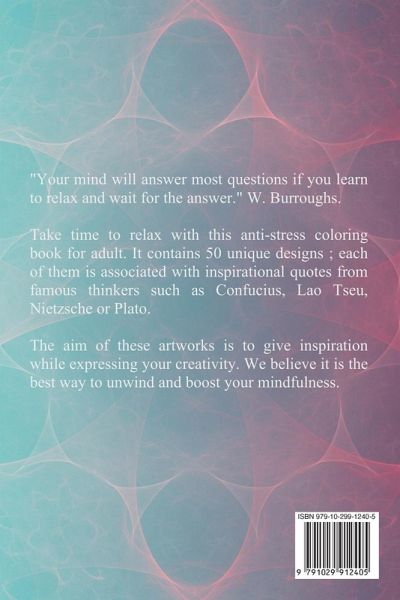 "Your mind will answer most questions if you learn to relax and wait for the answer." W. Burroughs. Take time to relax with this anti-stress coloring book for adult. It contains 50 unique designs ; each of them is associated with inspirational quotes from famous thinkers such as Confucius, Lao Tseu, Nietzsche or Plato. The aim of these artworks is to give inspiration while expressing your creativity. We believe it is the best way to unwind and boost your mindfulness.