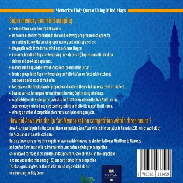How did Arwa win the Qur'an Memorization competition within three hours ? Arwa Al-Arja participated in the competition of memorizing Surat Yusuf with its interpretation in Ramadan 2018 , which was held by the Association of palestine Scholars. But only three hours before the competition were available to Arwa ,so she decided to use Mind Maps to Memorize and confirm Surat Yusuf with its interpretation ,and before entering the competition she reviewed her maps in ten minutes. And Surprisingly . she got (%99.5) in the competition and and was ranked third among (120) one participated in the competition Thanks to god Almighty and then thanks to Mind Maps which help her to memorizing the Holy Qur'an.