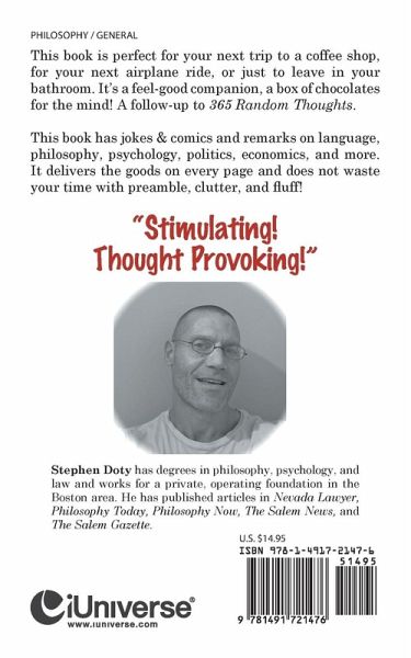 This book is perfect for your next trip to a coffee shop, for your next airplane ride, or just to leave in your bathroom. It's a feel-good companion, a box of chocolates for the mind! A follow-up to 365 Random Thoughts. This book has jokes & comics and remarks on language, philosophy, psychology, politics, economics, and more. It delivers the goods on every page and does not waste your time with preamble, clutter, and fluff! "Stimulating! Thought Provoking!"