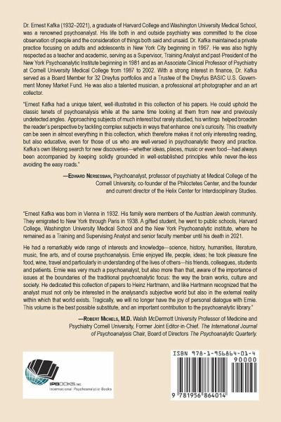 Dr. Ernest Kafka (1932-2021), a graduate of Harvard College and Washington University Medical School, was a renowned psychoanalyst. His life both in and outside psychiatry was committed to the close observation of people and the consideration of things both said and unsaid. Dr. Kafka maintained a private practice focusing on adults and adolescents in New York City beginning in 1967. He was also highly respected as a teacher and academic, serving as a Supervisor, Training Analyst and past-President of the New York Psychoanalytic Institute beginning in 1981 and as an Associate Clinical Professor of Psychiatry at Cornell University Medical College from 1987 to 2002. With a strong interest in finance, Dr. Kafka served as a Board Member for 32 Dreyfus portfolios and a Trustee of the Dreyfus BASIC U.S. Government Money Market Fund. He was also a talented musician, a professional art photographer and an art collector. Ernest Kafka had a unique talent, well-illustrated in this collection of his papers. He could uphold the classic tenets of psychoanalysis while at the same time looking at them from new and previously undetected angles. Approaching subjects of much interest but rarely studied, his writings helped broaden the reader's perspective by tackling complex subjects in ways that enhance one's curiosity. This creativity can be seen in almost everything in this collection, which therefore makes it not only interesting reading, but also educative, even for those of us who are well-versed in psychoanalytic theory and practice. Kafka's own lifelong search for new discoveries-whether ideas, places, music or even food-had always been accompanied by keeping solidly grounded in well-established principles while never-the-less avoiding the easy roads. -Edward Nersessian, Psychoanalyst, professor of psychiatry at Medical College of the Cornell University, co-founder of the Philoctetes Center, and the founder and current director of the Helix Center for Interdisciplinary Studies. Ernest Kafka was born in Vienna in 1932. His family were members of the Austrian Jewish community. They emigrated to New York through Paris in 1938. A gifted student, he went to public schools, Harvard College, Washington University Medical School and the New York Psychoanalytic institute, where he remained as a Training and Supervising Analyst and senior faculty member until his death in 2021. He had a remarkably wide range of interests and knowledge-science, history, humanities, literature, music, fine arts, and of course psychoanalysis. Ernie enjoyed life people, ideas; he took pleasure fine food, wine, travel and particularly in understanding of the lives of others-his friends, colleagues, students and patients. Ernie was very much a psychoanalyst, but also more than that, aware of the importance of issues at the boundaries of the traditional psychoanalytic focus: the way the brain works, culture and society. He dedicated this collection of papers to Heinz Hartmann, and like Hartmann recognized that the analyst must not only be interested in the analysand's subjective world but also in the external reality within which that world exists. Tragically, we will no longer have the joy of personal dialogue with Ernie. This volume is the best possible substitute, and an important contribution to the psychoanalytic library. -Robert Michels, M.D. Walsh McDermott University Professor of Medicine and Psychiatry Cornell University, Former Joint Editor-in-Chief. The International Journal of Psychoanalysis Chair, Board of Directors The Psychoanalytic Quarterly.