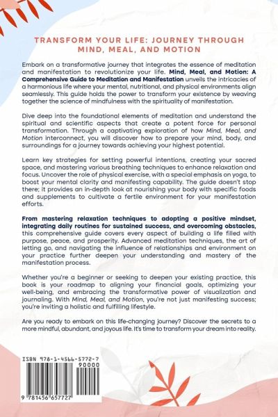 Transform Your Life: Journey Through Mind, Meal, and Motion Embark on a transformative journey that integrates the essence of meditation and manifestation to revolutionize your life. Mind, Meal, and Motion: A Comprehensive Guide to Meditation and Manifestation unveils the intricacies of a harmonious life where your mental, nutritional, and physical environments align seamlessly. This guide holds the power to transform your existence by weaving together the science of mindfulness with the spirituality of manifestation. Dive deep into the foundational elements of meditation and understand the spiritual and scientific aspects that create a potent force for personal transformation. Through a captivating exploration of how Mind, Meal, and Motion interconnect, you will discover how to prepare your mind, body, and surroundings for a journey towards achieving your highest potential. Learn key strategies for setting powerful intentions, creating your sacred space, and mastering various breathing techniques to enhance relaxation and focus. Uncover the role of physical exercise, with a special emphasis on yoga, to boost your mental clarity and manifesting capability. The guide doesn't stop there; it provides an in-depth look at nourishing your body with specific foods and supplements to cultivate a fertile environment for your manifestation efforts. From mastering relaxation techniques to adopting a positive mindset, integrating daily routines for sustained success, and overcoming obstacles, this comprehensive guide covers every aspect of building a life filled with purpose, peace, and prosperity. Advanced meditation techniques, the art of letting go, and navigating the influence of relationships and environment on your practice further deepen your understanding and mastery of the manifestation process. Whether you're a beginner or seeking to deepen your existing practice, this book is your roadmap to aligning your financial goals, optimizing your well-being, and embracing the transformative power of visualization and journaling. With Mind, Meal, and Motion, you're not just manifesting success; you're inviting a holistic and fulfilling lifestyle. Are you ready to embark on this life-changing journey? Discover the secrets to a more mindful, abundant, and joyous life. It's time to transform your dream into reality.