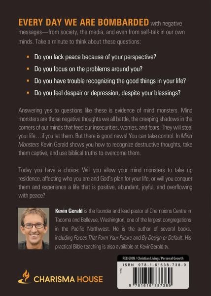 Every day we are bombarded with negative messages--from society, the media, and even from self-talk in our own minds. Take a minute to think about these questions: * Do you lack peace because of your perspective? * Do you focus on the problems around you? * Do you have trouble recognizing the good things in your life? * Do you feel despair or depression, despite your blessings? Answering yes to questions like these is evidence of mind monsters. Mind monsters are those negative thoughts we all battle, the creeping shadows in the corners of our minds that feed our insecurities, worries, and fears. They will steal your life...if you let them. But there is good news! You can take control. In Mind Monsters Kevin Gerald shows you how to recognize destructive thoughts, take them captive, and use biblical truths to overcome them. Today you have a choice: Will you allow your mind monsters to take up residence, affecting who you are and God's plan for your life, or will you conquer them and experience a life that is positive, abundant, joyful, and overflowing with peace?