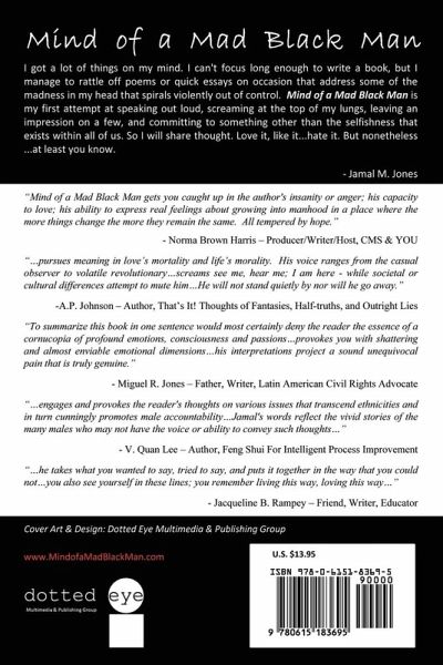 "Mind of a Mad Black Man," written by Jamal M. Jones, represents the first part of a journey.a struggle to exit his twenties while dealing with relationships, career, social challenges, and the evolution into the role of man.a black man. Through his poems and essays he documents his frustrations, struggles, joys, and pains of that process. Set in a tone that seems to never expire, but instead to inspire, "Mind of a Mad Black Man" will cause the mind, soul, and heart to reflect on their past and question their future.