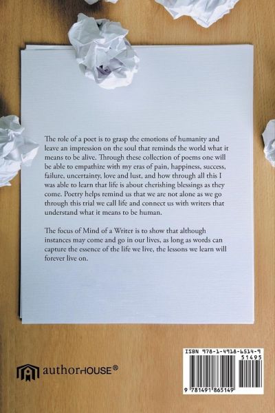 The role of a poet is to grasp the emotions of humanity and leave an impression on the soul that reminds the world what it means to be alive. Through these collection of poems one will be able to empathize with my eras of pain, happiness, success, failure, uncertainty, love and lust, and how through all this I was able to learn that life is about cherishing blessings as they come. Poetry helps remind us that we are not alone as we go through this trial we call life and connect us with writers that understand what it means to be human. The focus of Mind of a Writer is to show that although instances may come and go in our lives, as long as words can capture the essence of the life we live, the lessons we learn will forever live on.