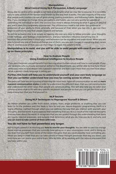 Manipulation Mind Control Using NLP, Persuasion, & Body LanguageBeing able to control other people is not hard at all despite what we may like to assume. It is incredibly easy to take control of the human mind thanks to the way that it works. The vast majority of the ways that people work involves the use of generalizing, making predictions, and following habits. Because of this, if you can begin to change those perceptions and habits, you can very quickly be capable of controlling the individual as well. The unconscious mind is always listening to what is going on around you, and it does this completely unprotected. The unconscious mind is not under the guidance or protection of your ability to think rationally, and because of that, when you tap into it, you can then begin to control the way that people respond and behave.To control someone else is as simple as tapping into one very easy to follow principle-your thoughts create feelings, your feelings create behaviors, and your behaviors influence everything else. It becomes this perfect loop in which your own behaviors can be regulated and understood. When you are able to break into one of them and change one of them, you see real changes in everything that comes after it, and because of that, you can then begin to hijack the people's mind. How to Analyze People Using Emotional Intelligence to Analyze PeopleIf you are a beginner, you will benefit from learning about human nature and how to read people. If you are someone who is already somewhat skilled in this department, you will be able to fine-tune those skills even more to read deeper into a person's behavior and learn even more than you ever have about what a person's body language is telling you.Further, this book will help you to understand yourself and your own body language so that you can better understand how you may be coming across to others. NLP Secrets Using NLP Techniques to Reprogram Yourself & Others No matter whether you suffer from stress, anxiety, fears, anger problems, or anything else, you can learn to fix the problem and this book is here to help you. Neuro-linguistic programming (NLP) is a highly effective method through which you can address the way that you interact with yourself, your thoughts, and the world. It presupposes that everything that you do is a result of the internal thoughts that you have about the world. It recognizes that you are guided through the understanding that there are inputs, internal processes, and outputs that determine what you do, how you do it, and why, and you can learn to take control of them with ease.You do not have to feel powerless any longer.