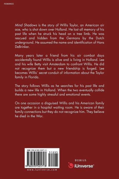Mind Shadows is the story of Willis Taylor, an American air ace, who is shot down over Holland. He lost all memory of his past life when he struck his head on a tree limb. He was rescued and hidden from the Germans by the Dutch underground. He assumed the name and identification of Hans DeBrinker. Many years later a friend from his air combat days accidentally found Willis is alive and is living in Holland. Lee and his wife Betty visit Amsterdam to confront Willis. He did not recognize them but a new friendship is forged. Lee becomes Willis' secret conduit of information about the Taylor family in Florida. The story follows Willis as he searches for his past life and builds a new life in Holland. When the two eventually collide there are some highly stressful and emotional events. On one occasion a disguised Willis and his American family are together in a hospital waiting room. He is aware of their family connections but they do not recognize him. They believe he died in the War.