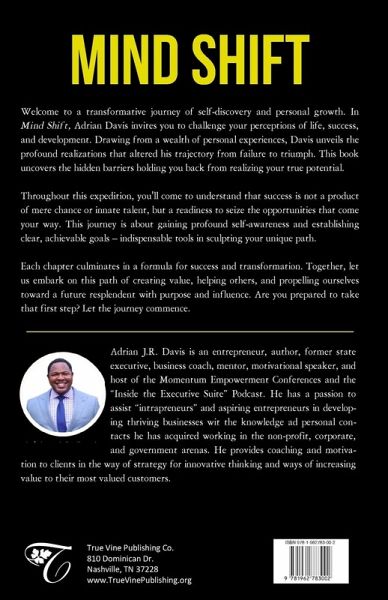 Welcome to a transformative journey of self-discovery and personal growth. In Mind Shift, Adrian Davis invites you to challenge your perceptions of life, success, and development. Drawing from a wealth of personal experiences, Davis unveils the profound realizations that altered his trajectory from failure to triumph. This book uncovers the hidden barriers holding you back from realizing your true potential. Throughout this expedition, you'll come to understand that success is not a product of mere chance or innate talent, but a readiness to seize the opportunities that come your way. This journey is about gaining profound self-awareness and establishing clear, achievable goals - indispensable tools in sculpting your unique path. Each chapter culminates in a formula for success and transformation. Together, let us embark on this path of creating value, helping others, and propelling ourselves toward a future resplendent with purpose and influence. Are you prepared to take that first step? Let the journey commence.