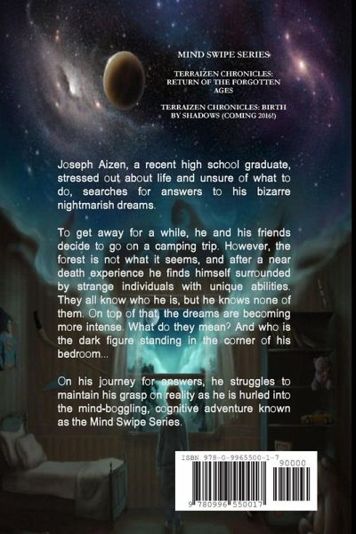 Joseph Aizen, a recent high school graduate, stressed out about life and unsure of what to do, searches for answers to his bizarre nightmarish dreams. To get away for a while, he and his friends decide to go on a camping trip. However, the forest is not what it seems, and after a near death experience he finds himself surrounded by strange individuals with unique abilities. They all know who he is, but he knows none of them. On top of that, the dreams are becoming more intense. What do they mean? And who is the dark figure standing in the corner of his bedroom... On his journey for answers, he struggles to maintain his grasp on reality as he is hurled into the mind-boggling, cognitive adventure known as the Mind Swipe Series.