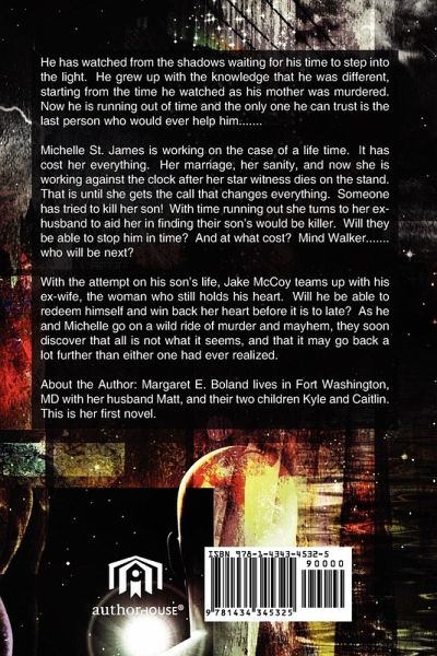 He has watched from the shadows waiting for his time to step into the light. He grew up with the knowledge that he was different, starting from the time he watched as his mother was murdered. Now he is running out of time and the only one he can trust is the last person who would ever help him....... Michelle St. James is working on the case of a life time. It has cost her everything. Her marriage, her sanity, and now she is working against the clock after her star witness dies on the stand. That is until she gets the call that changes everything. Someone has tried to kill her son! With time running out she turns to her ex-husband to aid her in finding their son's would be killer. Will they be able to stop him in time? And at what cost? Mind Walker.......who will be next? With the attempt on his son's life, Jake McCoy teams up with his ex-wife, the woman who still holds his heart. Will he be able to redeem himself and win back her heart before it is to late? As he and Michelle go on a wild ride of murder and mayhem, they soon discover that all is not what it seems, and that it may go back a lot further than either one had ever realized. About the Author: Margaret E. Boland lives in Fort Washington, MD with her husband Matt, and their two children Kyle and Caitlin. This is her first novel.