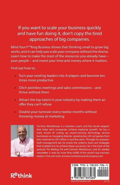 If you want to scale your business quickly and have fun doing it, don't copy the tired approaches of big companies. Mind Your F**king Business shows that thinking small to grow big works, and it can help you scale your company without the drama. Learn how to make the most of the resources you already have - your people - and invest your time and money where it matters. Find out how to: * Turn your existing leaders into A-players and become ten time more productive * Ditch pointless meetings and sales commissions - and thrive without them * Attract the top talent in your industry by making them an offer they can't refuse * Double your turnover every twelve months without throwing money at marketing