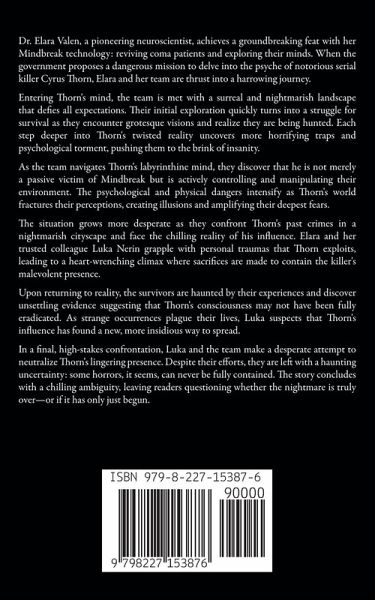 Dr. Elara Valen, a pioneering neuroscientist, achieves a groundbreaking feat with her Mindbreak technology: reviving coma patients and exploring their minds. When the government proposes a dangerous mission to delve into the psyche of notorious serial killer Cyrus Thorn, Elara and her team are thrust into a harrowing journey. Entering Thorn's mind, the team is met with a surreal and nightmarish landscape that defies all expectations. Their initial exploration quickly turns into a struggle for survival as they encounter grotesque visions and realize they are being hunted. Each step deeper into Thorn's twisted reality uncovers more horrifying traps and psychological torment, pushing them to the brink of insanity. As the team navigates Thorn's labyrinthine mind, they discover that he is not merely a passive victim of Mindbreak but is actively controlling and manipulating their environment. The psychological and physical dangers intensify as Thorn's world fractures their perceptions, creating illusions and amplifying their deepest fears. The situation grows more desperate as they confront Thorn's past crimes in a nightmarish cityscape and face the chilling reality of his influence. Elara and her trusted colleague Luka Nerin grapple with personal traumas that Thorn exploits, leading to a heart-wrenching climax where sacrifices are made to contain the killer's malevolent presence. Upon returning to reality, the survivors are haunted by their experiences and discover unsettling evidence suggesting that Thorn's consciousness may not have been fully eradicated. As strange occurrences plague their lives, Luka suspects that Thorn's influence has found a new, more insidious way to spread. In a final, high-stakes confrontation, Luka and the team make a desperate attempt to neutralize Thorn's lingering presence. Despite their efforts, they are left with a haunting uncertainty: some horrors, it seems, can never be fully contained. The story concludes with a chilling ambiguity, leaving readers questioning whether the nightmare is truly over-or if it has only just begun.