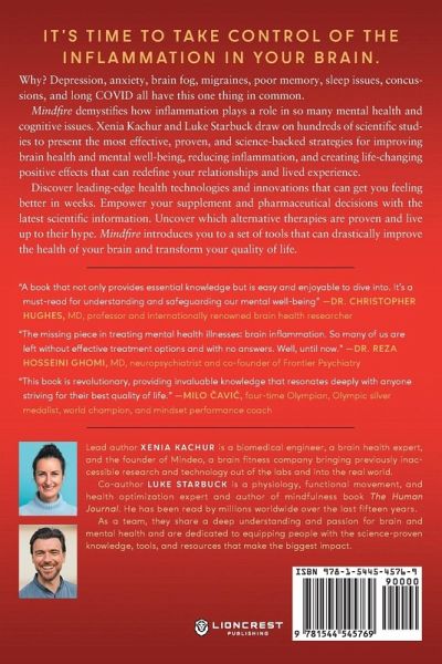 It's time to take control of the inflammation in your brain. Why? Depression, anxiety, brain fog, migraines, poor memory, sleep issues, concussions, and long COVID all have this one thing in common. Mindfire demystifies how inflammation plays a role in so many mental health and cognitive issues. Xenia Kachur and Luke Starbuck draw on hundreds of scientific studies to present the most effective, proven, and science-backed strategies for improving brain health and mental well-being, reducing inflammation, and creating life-changing positive effects that can redefine your relationships and lived experience. Discover leading-edge health technologies and innovations that can get you feeling better in weeks. Empower your supplement and pharmaceutical decisions with the latest scientific information. Uncover which alternative therapies are proven and live up to their hype. Mindfire introduces you to a set of tools that can drastically improve the health of your brain and transform your quality of life. "This book sheds light on the missing piece in treating mental health illnesses: brain inflammation. Our field has focused almost exclusively on talk therapy and pharmaceuticals with not a lot to show for it. So many of us are left without effective treatment options and with no answers. Well, until now. Kachur expertly distills hundreds of scientific studies into an accessible guide, unveiling the surprising link between inflammation and mental well-being, and then provides tools to do something about it. It's a must-read." -Dr. Reza Hosseini Ghomi, MD, neuropsychiatrist and co-founder of Frontier Psychiatry